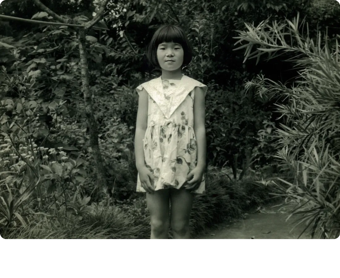 須影小学校2年生の頃、ご近所の垣根前での写真。