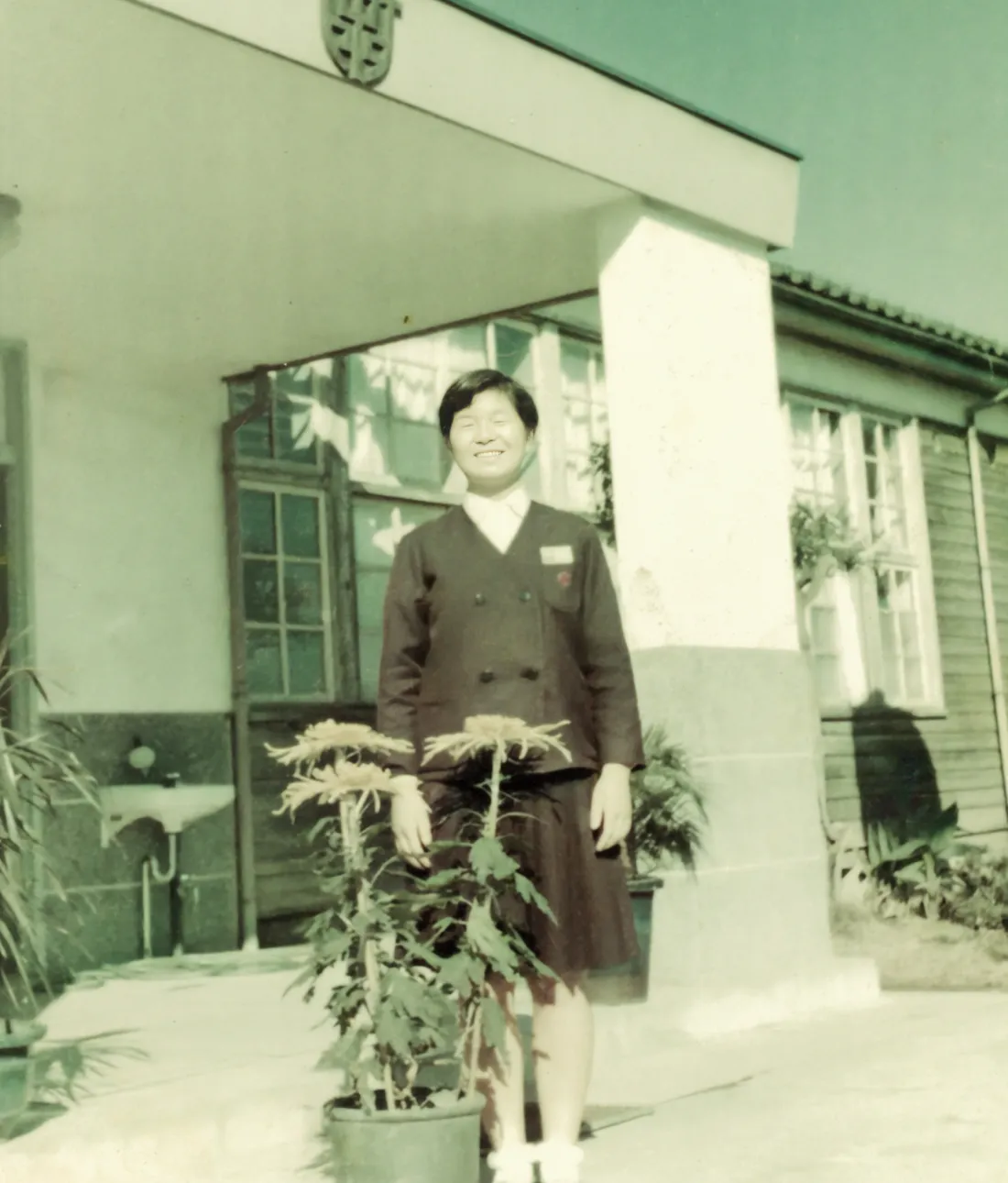須影中学校3年生の頃、授業で育てた三本仕立ての菊とともに記念写真。